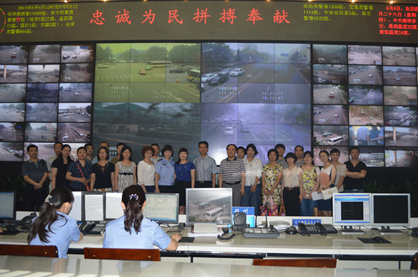 接著大家來到鐫刻有“忠誠為民、拼搏奉獻”字樣的全市交通路況顯示屏前。大屏幕上顯示著鄭州市各個主要單位、部位和重要道路交叉路口的即時信息,具有GPS定位功能的警車在不停地移動,視頻畫面依序切換,“原來每時每刻都有幾百輛警車在街面巡邏,每個路口都有監(jiān)控??礃幼?,鄭州市的安保工作還是有保障的,以后更要規(guī)范自己的言行,遵守交通規(guī)則”大家很是感慨。